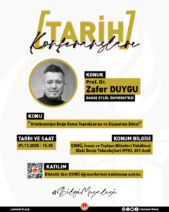 Prof. Dr. Zafer DUYGU’nun “Hristiyanlığın Doğu Roma Topraklarına ve Siyasetine Etkisi” başlıklı değerli anlatımını dinleyeceğimiz konferans, 1 Aralık 2025 tarihinde İnsan ve Toplum Bilimleri Fakültesinde (Eski Denizcilik MYO) bulunan 201 numaralı amfide tüm ÇOMÜ öğrencilerinin katılımına açık şekilde gerçekleşecektir.